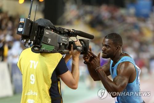 | △ (도하 AP=연합뉴스) 미국 스프린터 저스틴 게이틀린16일(한국시간) 카타르 도하에서 열린 국제육상경기연맹(IAAF) 다이아몬드리그 남자 100m 결승에서 9초74로 우승을 차지한 후 방송 카메라를 향해 우승 세리머니를 하고 있다. |