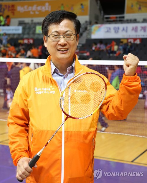 | △ 최성 고양시장 "다문화 가족, 소중한 시민이죠" (고양=연합뉴스) 강성철 기자 = 16일 경기도 고양시 고양체육관에서 열린 '2015 전국 다문화가족 배드민턴대회'를 후원한 최성 고양시장은 개막식에서 축사 후 코트에 들어가 배트민턴 실력을 선보였다. 2015. 5.16 wakaru@yna.co.kr |