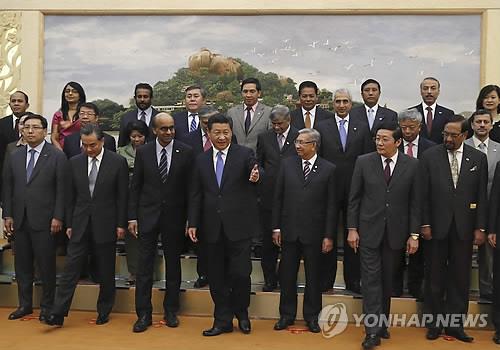 | △ 2014년 10월24일 중국 베이징 인민대회당에서 AIIB 참가의사를 밝힌 각국 대표 등이 양해각서(MOU) 체결식에서 기념 촬영하는 모습.(AP=연합뉴스DB) |