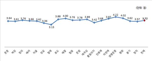 전체 덕목 중 가장 낮은 점수를 받은 항목은 절제로 3.13점에 그쳤다. 성실(3.36점), 통일의지(3.42점), 정직(3.57점) 등도 하위권에 속했다.