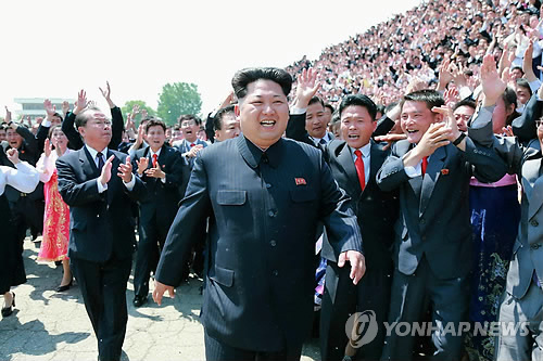 | △ 북한 김정은, 청년미풍선구자대회 참가자와 기념사진 (서울=연합뉴스) 김정은 북한 국방위원회 제1위원장이 제2차 전국청년미풍선구자대회 참가자들과 기념사진을 찍었다고 노동신문이 17일 보도했다. 촬영에는 황병서 군 총정치국장, 최룡해 노동당 비서, 리일환 당 부장, 전용남 청년동맹 중앙위원장이 함께했다. 사진은 김 제1위원장이 촬영에 참여한 주민들로부터 환호를 받는 모습. 2015.5.17 nkphoto@yna.co.kr |