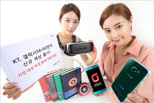 KT는 다음달 7일까지 새로운 색상의 갤럭시S6 시리즈 모델을 개통한 뒤 14일까지 인터넷 응모하면 추첨을 통해 가상현실 헤드셋 기어VR(60명), 어벤저스 무선충전기(300명) 등을 제공한다.