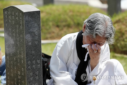 | △ 깊은 슬픔 (광주=연합뉴스) 형민우 기자 = 17일 오전 광주 북구 운정동 국립 5·18민주묘지에서 한 어머니가 아들의 묘 앞에서 오열하고 있다. |