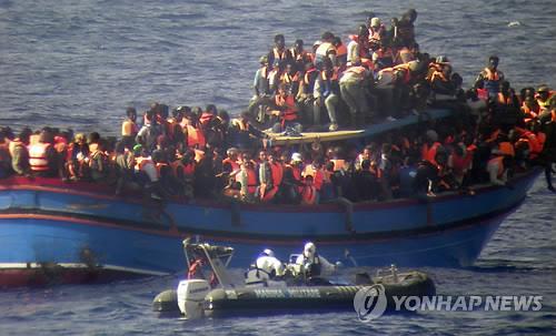 | △ (AP/이탈리아 해군=연합뉴스) 이탈리아 해군 보트가 2014년 6월29일(현지시간) 시칠리아섬과 북아프리카 해안 사이의 지중해 한복판에 멈춰선 어선으로 다가가고 있다. 이 어선에는 난민 600여명이 발디딜틈 없이 타고 있었으며 질식사한 것으로 보이는 시신 30여구가 발견됐다. |