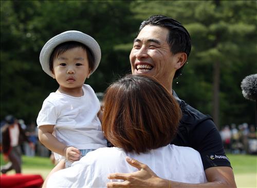 마지막 홀에서 트리플 보기를 적어냈지만 벌어놓은 타수 덕에 우승을 차지한 문경준은 23개월된 아들과 아내를 얼싸안고 기쁨을 나눴다.