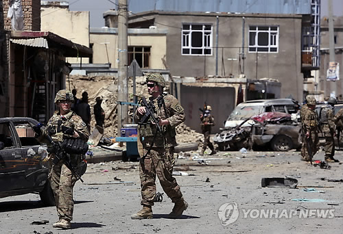 | △ 아프간 EU경찰 차량에 자폭테러 (카불 AP=연합뉴스) 17일(현지시간) 아프가니스탄 카불 국제공항 검문소 부근의 탈레반 자살 차량폭탄 공격 현장에서 미군이 순찰 및 조사에 나서고 있다. 유럽연합 경찰훈련단(EUPOL) 차량을 겨냥한 이날 테러로 외국인 1명 등 3명이 숨지고 18명이 다쳤다. 자폭 차량 탑승자 1명도 사망한 것으로 알려졌다. bulls@yna.co.kr |