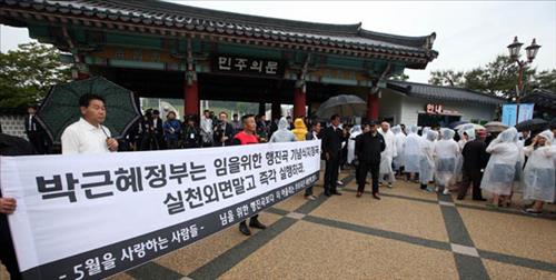 5·18 민주화운동 35주년 기념식에서 여야 대표 모두 '님을 위한 행진곡'을 불렀다. 새누리당 김무성·새정치민주연합 문재인 대표는 오늘 오전 광주 북구 운정동 국립 5·18민주묘지에서 열린 기념식 맨 앞줄에 나란히 앉았다. 국민의례, 헌화 분향, 경과보고, 기념사에 이어 '님을 위한 행진곡'을 부르는 기념공연 순서가 되자 두 대표는 함께 일어나 합창단이 부르는 '님을 위한 행진곡'을 따라 불렀다. 2009년부터 '님을 위한 행진곡'은 참가자가 모두 부르는 제창이 아닌 합창단이 부르는 합창 형태로 공연되고 있다. 두 대표는 합창단에 맞춰 '님을 위한 행진곡'을 끝까지 따라 불렀다. 행사장에 참석한 정의화 국회의장을 비롯해 여야 지도부, 국회의원, 당직자 등도 대체로 태극기를 흔들며 노래를 불렀다.