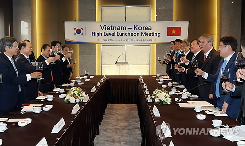 | △ 임종룡, 베트남 부총리에 '한국금융사 진출' 협조요청 (서울=연합뉴스) 김주성 기자 = 임종룡 금융위원장이 18일 오전 서울 중구 플라자호텔에서 부 반 닝 베트남 경제부총리가 이끄는 정부대표단과 오찬을 겸한 면담을 하기에 앞서 건배를 하고 있다. 이날 면담에서 임 위원장은 부 반 닝 베트남 경제부총리에게 한국 금융기업의 베트남 진출을 도와달라고 요청했다. |