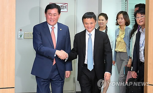 | △ 입장하는 최경환-마윈 (서울=연합뉴스) 한종찬 기자 = 최경환 부총리 겸 기획재정부 장관(왼쪽)이 18일 서울 양재동 aT센터에서 'T-mall내 한국관 개통식'에 참석차 방한한 마윈 알리바바 회장과 함께 회의실로 향하고 있다. |