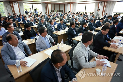 | △ 긴급 임시 총회 기다리는 관계자들 (서울=연합뉴스) 박동주 기자 = 18일 오후 서울 여의도 중소기업중앙회 제1대연회실에서 개성공단기업협회 관계자들이 긴급 임시 총회 시작을 기다리고 있다. |