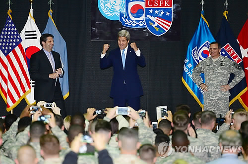 | △ 인사하는 존 케리 미 국무장관 (서울 사진공동취재단=연합뉴스) 존 케리 미국 국무장관이 18일 오후 서울 용산구 주한미군기지를 방문해 주한미군들에게 인사를 하고 있다. |
