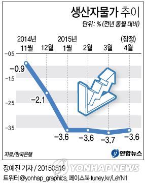 3월 생산자물가지수는 2010년 11월(101.78) 이후 4년4개월 만에 최저치로 떨어졌는데, 4월에도 이 상태가 지속된 것이다.