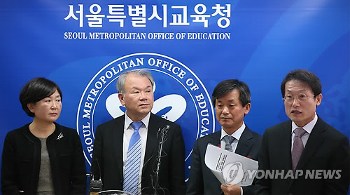 | △ 지난 3월 조희연 서울시 교육감을 비롯한 서울시 교육청 관계자들이 서울시 교육청 브리핑룸에서 국내 첫 고교 자유학년제인 '오디세이 학교' 시범 운영에 대한 기본안을 발표하고 있다. (연합뉴스 자료사진) |