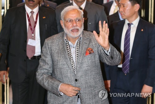 | △ 손 흔드는 모디 인도 총리 (서울=연합뉴스) 임헌정 기자 = 나렌드라 모디 인도 총리가 국내 대기업 CEO들과의 면담을 위해 19일 서울 중구 밀레니엄 힐튼 호텔로 들어서며 손을 흔들고 있다. |