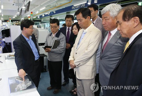 | △ 산업혁신운동 스마트공장 현장견학 (서울=연합뉴스) 대한상공회의소와 산업통상자원부가 20일 오후 실시한 '산업혁신운동 스마트공장 현장견학'에서 중견·중소기업 임직원들이 경북 창조경제혁신센터를 찾아 현장교육을 받고, 관련 생산설비를 체험하고 있다. (대한상의 제공) |