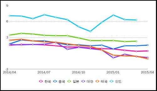 2009년 이후 최악의 디플레이션을 겪고 있는 것으로 평가되는 대만과 태국은 각각 -0.8%, -1.0%를 나타냈다.