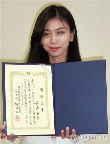 | △ 사이토 리에(齊藤里惠·여·31) 의원이 2015년 4월 27일 당선증을 받아서 펼쳐보이고 있다. (교도=연합뉴스 자료사진) |