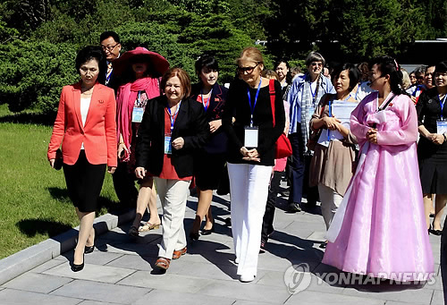| △ 위민크로스DMZ 여성운동가들, 평양 만경대 방문 (평양 AP=연합뉴스) 미국의 세계적 여성운동가 글로리아 스타이넘(가운데 오른쪽)과 1976년 노벨평화상 수상자인 북아일랜드의 메어리드 매과이어(가운데 왼쪽) 등 국제여성평화 운동가들이 20일 김일석 주석 생가가 있는 평양 만경대를 방문하고 있다. 이들은 오는 24일 비무장지대(DMZ)를 걸어서 북한에서 남한으로 넘어오는 '위민크로스DMZ'(WCD) 행사를 벌일 예정이다. |