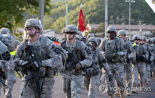 | △ 행군하는 미군 (동두천=연합뉴스) 임병식 기자 = 20일 오후 경기도 동두천시 캠프 케이시에서 만추(Manchu) 행군에 참가한 미2사단 장병이 줄지어 이동하고 있다. 만추 행군은 1900년 중국 의화단 운동 때 전투를 벌였던 미군이 136㎞를 행군했던 일을 상기하는 훈련이다. 미군 순환배치로 미2사단 예하 1여단이 해체되면서 이번 만추 행군이 한반도에서 마지막 행군이 됐다. |