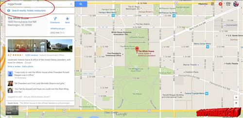 20일(현지시간) 워싱턴포스트와 정보기술(IT) 전문 매체인 시넷 등에 따르면, 인터넷 구글 지도에서 미국 워싱턴DC를 연 뒤 검색창에 '깜둥이의 집'(nigger house) 또는 '깜둥이의 왕'(nigger king)이라는 단어를 넣으면 백악관이 뜨는 어처구니 없는 사고가 전날 발생했다.