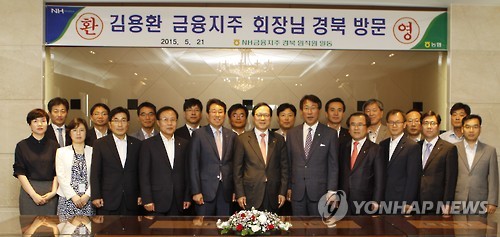 | △ 김용환 NH농협금융지주회장 경북 방문 (대구=연합뉴스) 김용환 NH농협금융지주 회장이 21일 NH농협은행 경북영업본부를 방문해 경북지역 자회사 대표 등 직원들과 기념촬영을 하고 있다. 2015.5.21 haru@yna.co.kr |