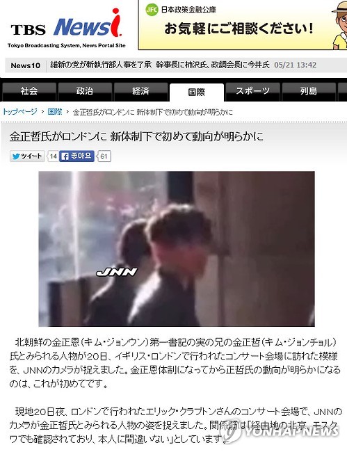 | △ 일 TBS "북한 김정철 추정인물 런던서 포착" (서울=연합뉴스) 김정은 북한 국방위원회 제1위원장의 친형인 김정철로 추정되는 인물의 모습이 영국 런던에서 포착됐다고 일본 민영방송 TBS가 21일 보도했다. 2015.5.21 << TBS 홈페이지 캡처 >> toadboy@yna.co.kr |