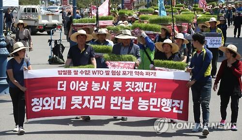 | △ 행진하는 전국농민회총연맹 (서울=연합뉴스) 한종찬 기자 = 21일 오후 서울역 광장에서 전국농민회총연맹 주최로 열린 '밥쌀용 쌀 수입 규탄대회'에서 참가자들이 모판을 들고 행진하고 있다. |