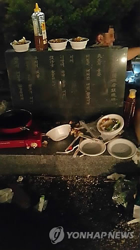 | △ (서울=연합뉴스) 설승은 기자 고려대에서 5.18민주화운동 기념일에 일부 학과 학생들이 교내 민주광장 민주열사추모비 근처에서 주점을 운영하면서 추모비를 술안주와 쓰레기 등으로 어지럽혀 교내외에서 비판을 받았다. 2015. 5. 21 <<고려대 경제학과 학생회 페이스북>> ses@yna.co.kr |