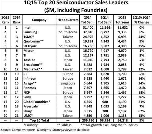 10위권 내에서 매출 증가율이 가장 높은 곳은 대만의 파운드리 전문업체인 TSMC로 지난해 1분기 48억5천200만달러에서 올해 1분기 69억9천500만달러로 44% 늘어났다.