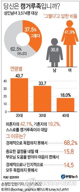 미혼자는 42.1%, 기혼자는 19.2%가 스스로를 캥거루족이라 불렀다. 이 중 20대 기혼자는 25.8%, 30대 기혼자는 20.4%였다.