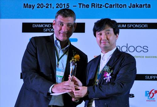 | △ 시상자인 앰독스 싱가포르지사 가이모르도치 부회장과 수상자인 KT 미디어본부 모바일TV 사업담당 박정호 상무(왼쪽부터). |