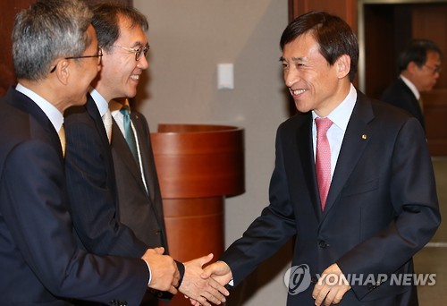 | △ 시중은행장들과 악수하는 이주열 한은 총재 (서울=연합뉴스) 임헌정 기자 = 이주열 한국은행 총재가 22일 오전 서울 중구 남대문로 한국은행 본관에서 열린 금융협의회에서 시중은행장들과 악수하고 있다. |