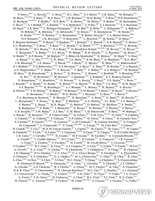 | △ 논문 한 편에 저자가 무려 5천154명 '세계신기록' (샌프란시스코=연합뉴스) 임화섭 특파원 = 물리학 권위지 '피지컬 리뷰 레터스'(PRL)에 지난 14일 게재된 공저자 수가 5천154명인 논문. 이는 공저자 수가 가장 많은 학술논문의 세계 신기록이다. 논문의 분량은 33쪽이지만, 저자의 수가 워낙 많아서 저자 목록에 논문 전체 분량의 4분의 3인 24쪽 반이 쓰였다. 사진은 저자 목록의 일부인 해당 논문의 제10페이지. 2015.5.22 solatido@yna.co.kr |