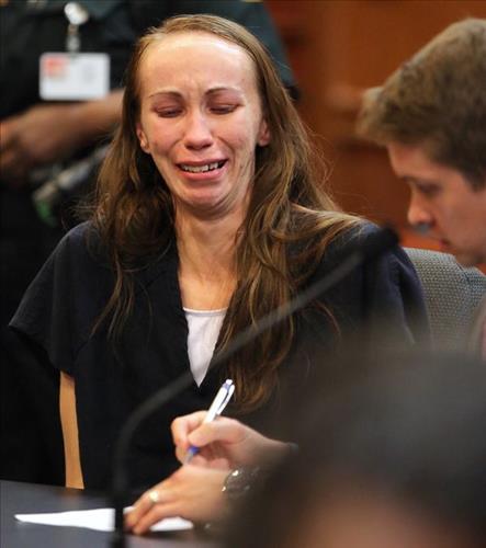 | △ 미국 플로리다 주에 사는 여성 헤서 히로니머스가 22일(현지시간) 법원에서 법률대리인을 통해 아들의 포경수술 동의서에 서명하면서 울고 있다. |