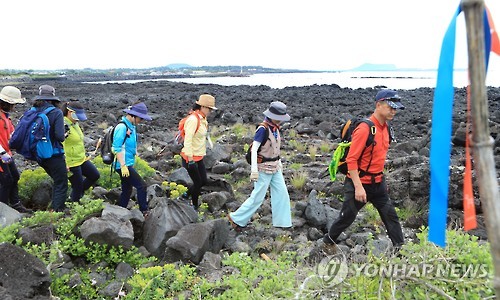 | △ (서귀포=연합뉴스) 전지혜 기자 = 23일 개장한 제주올레 3-B코스에서 올레꾼들이 도보 여행을 즐기고 있다. 3-B코스는 서귀포시 성산읍 온평포구에서 통오름∼독자봉∼김영갑 갤러리로 이어진 기존의 3코스(3-A) 전반부와 달리 온평 숲길∼신산 환해장성∼신산포구∼농개(농어개) 등 해안을 따라 이어지는 새 코스다. 두 코스는 중반부를 넘어서 신풍신천 바다목장에서 합쳐진다. 2015.5.23 atoz@yna.co.kr |
