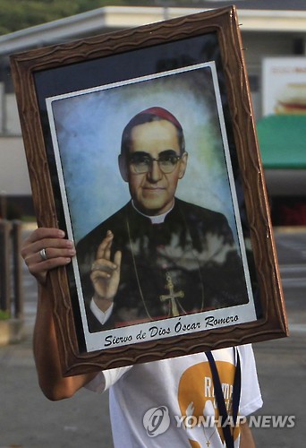 | △ (AP=연합뉴스) 한 가톨릭 신자가 23일(현지시간) 고 오스카 로메로 대주교에 대한 복자 칭호 부여식이 열린 엘살바도르 수도 산살바도르에서 로메로 대주교의 초상화를 들어 보이고 있다. |