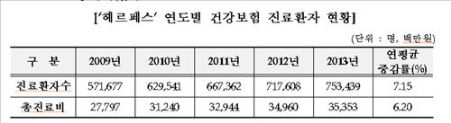 국민건강보험공단은 2009년부터 2013년까지 헤르페스 바이러스 감염으로 진료받은 건강보험 환자를 분석한 결과 총 진료인원은 2009년 57만명에서 2013년 75만명으로 연평균 7.15% 증가했다고 24일 밝혔다.