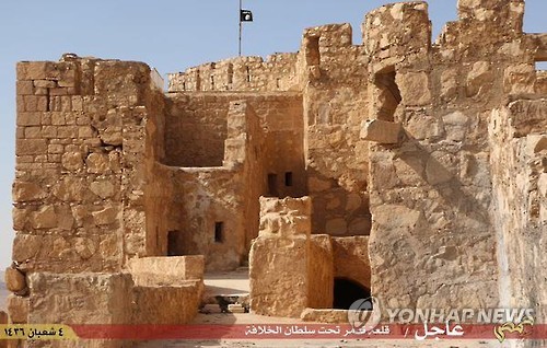 | △ IS, 시리아 팔미라 유적에 깃발 게양 (두바이=연합뉴스) 강훈상 특파원 = 수니파 무장조직 '이슬람국가'(IS)가 시리아 홈스 주(州)의 고대 유적도시 팔미라 점령을 과시하기 위해 유적에 깃발을 게양한 사진을 22일(현지시간) 인터넷을 통해 유포했다.2015.5.23 (출처 : 트위터) hskang@yna.co.kr |