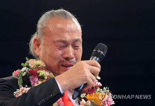 | △ 눈물의 은퇴식 (서울=연합뉴스) 이정훈 기자 = 노장 프로레슬러 이왕표가 25일 서울 중구 동호로 장충체육관에서 열린 WWA '이왕표 은퇴기념 포에버 챔피언'에서 은퇴사를 하며 눈물을 흘리고 있다. |