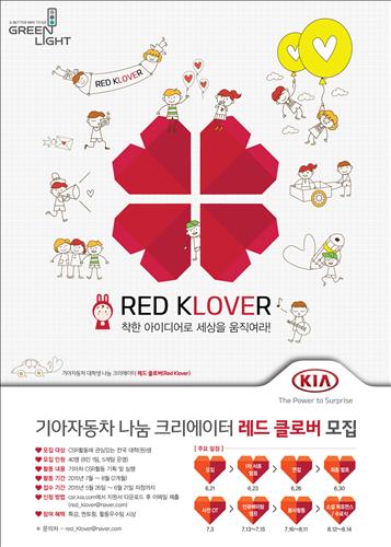 나눔 크리에이터 '레드 클로버' 참가를 원하는 학생은 오는 26일부터 내달 21일까지 기아차 CSR 홈페이지(http://csr.kia.com)에서 신청할 수 있다. 전국 2년제 이상 대학생(대학원생)이면 누구나 지원 가능하다.