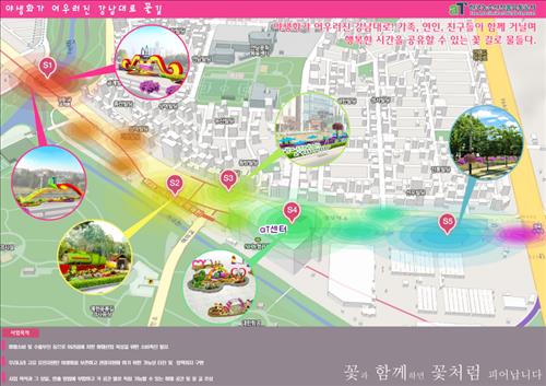 오는 10월까지 6개월간 영동1교부터 염곡4거리에 이르는 강남대로 약 1.7㎞ 구간에 페츄리아, 멜라포디움, 제라늄, 메리골드 등 꽃 총 2만5천송이로 조성한 꽃길을 운영한다.