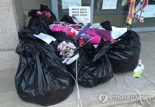 | △ 서울여대 총학, 노조 현수막 철거 (서울=연합뉴스) 서울여대 총학생회가 20일 축제 기간에 교내 미관을 해친다는 이유로 청소노동자들이 설치한 현수막을 철거해 논란이 일고 있다. 사진은 철거된 현수막. 2015.5.20 << 공공운수노조 서경지부 서울여대분회 제공 >> photo@yna.co.kr |