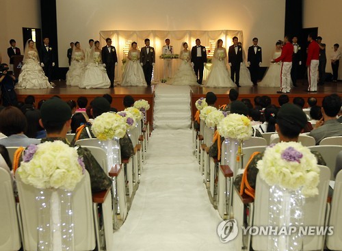 주인공은 병장 박용주(23)·김영숙(23), 병장 양영균(24)·노세영(23), 상병 추성민(22)·신자토유우나(24), 일병 서희근(22)·김길순(24), 일병 성종국(22)·최미연(23) 커플 등이다. 이 가운데 박 병장은 전날 전역했으며 이날 결혼식에 참여했다.