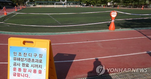 (수원=연합뉴스) 김경태 기자 = 유해 판정을 받은 경기지역 39개 학교의 인조잔디 운동장이 5개월이 되도록 개보수 공사를 미룬 채 방치되고 있어 학생 건강에 대한 우려가 커지고 있다.