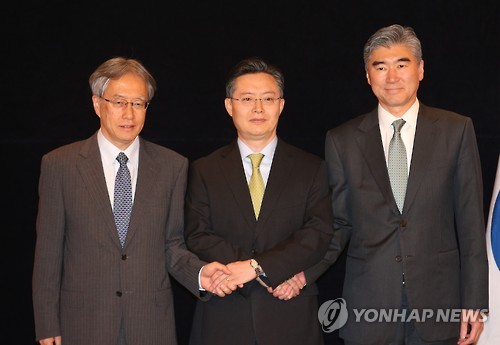 | △ 손 맞잡은 한·미·일 6자회담 수석대표 (서울=연합뉴스) 임헌정 기자 = 27일 서울 소공동 롯데호텔에서 열린 한·미·일 북핵 6자회담 수석대표 회의에서 황준국 외교부 한반도평화교섭본부장(가운데), 성 김 미국 국무부 대북정책 특별대표(오른쪽), 이하라 준이치(伊原純一) 일본 외무성 아시아대양주 국장이 포토세션을 하며 손을 맞잡고 있다. |