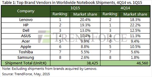 트렌드포스는 "삼성전자와 도시바의 낮은 점유율은 이들 기업이 격화되는 시장 경쟁 때문에 노트북 시장에서 철수하고 있기 때문"이라고 분석했다.