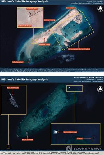 | △ 남중국해에 중국이 건설중인 인공섬 위성사진<IHS 제인스디펜스위클리 제공> |