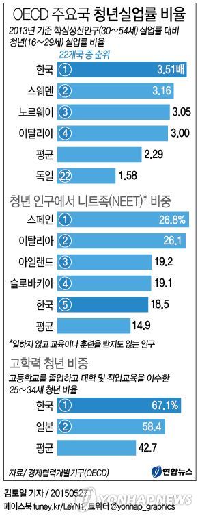 OECD가 27일 발표한 'OECD 직업역량 전망 2015' 보고서에 따르면 2013년 기준 핵심생산인구(30∼54세) 실업률 대비 청년(16∼29세) 실업률은 한국이 3.51배로 22개 OECD 조사 회원국 가운데 가장 높게 나타났다.