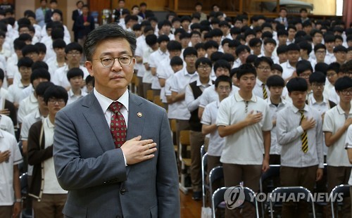 | △ 국민의례 하는 홍용표 장관 (서울=연합뉴스) 양지웅 기자 = 28일 오후 서울 동대문구 이문동 경희고등학교에서 열린 '제3회 통일교육주간' 행사에서 일일교사를 맡은 홍용표 통일부 장관이 국기에 대한 경례를 하고 있다. |