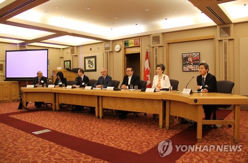 | △ (밴쿠버=연합뉴스) 조재용 통신원 = 27일(현지시간) 캐나다 오타와에서 열린 제4회 한국-캐나다 의회토론회에서 엘리엇 테퍼 칼튼대학 교수와 한인출신 연아 마틴(왼쪽부터) 상원의원 등 토론자들이 양국 관계 발전 방향에 대해 발언하고 있다. 2015.5.29 <<주 캐나다 대사관>> jaeycho@yna.co.kr |